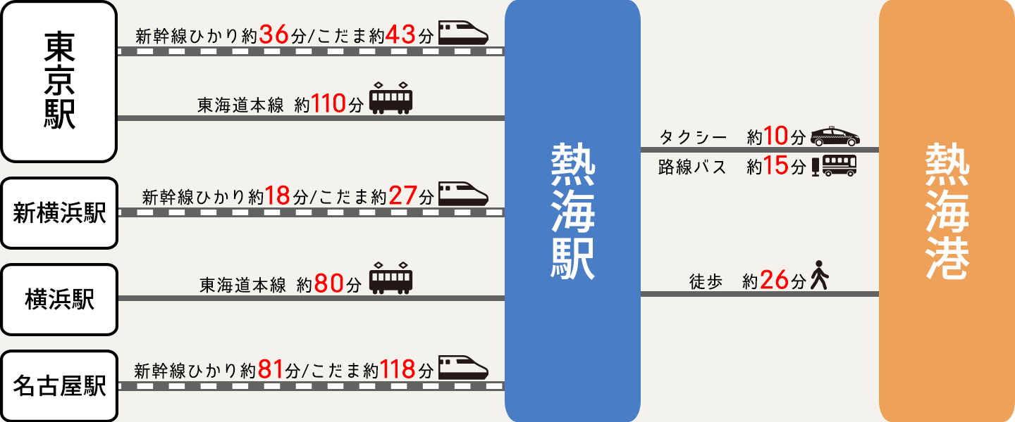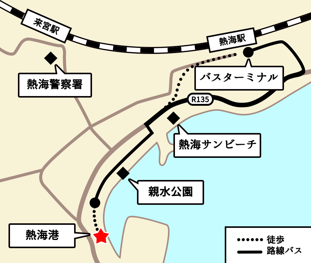 熱海駅から熱海港にはタクシー・バスまたは徒歩などで向かうことができます。