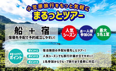 トラベルロードの「まるっとツアー」は、宿泊施設の手配を優先して行うため、人気シーズンでも小笠原旅行の計画を立てやすいのが特徴です。