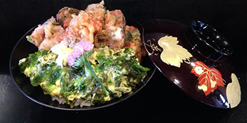 ②佐渡産のしいかのかき揚げ ナガモの卵とじ